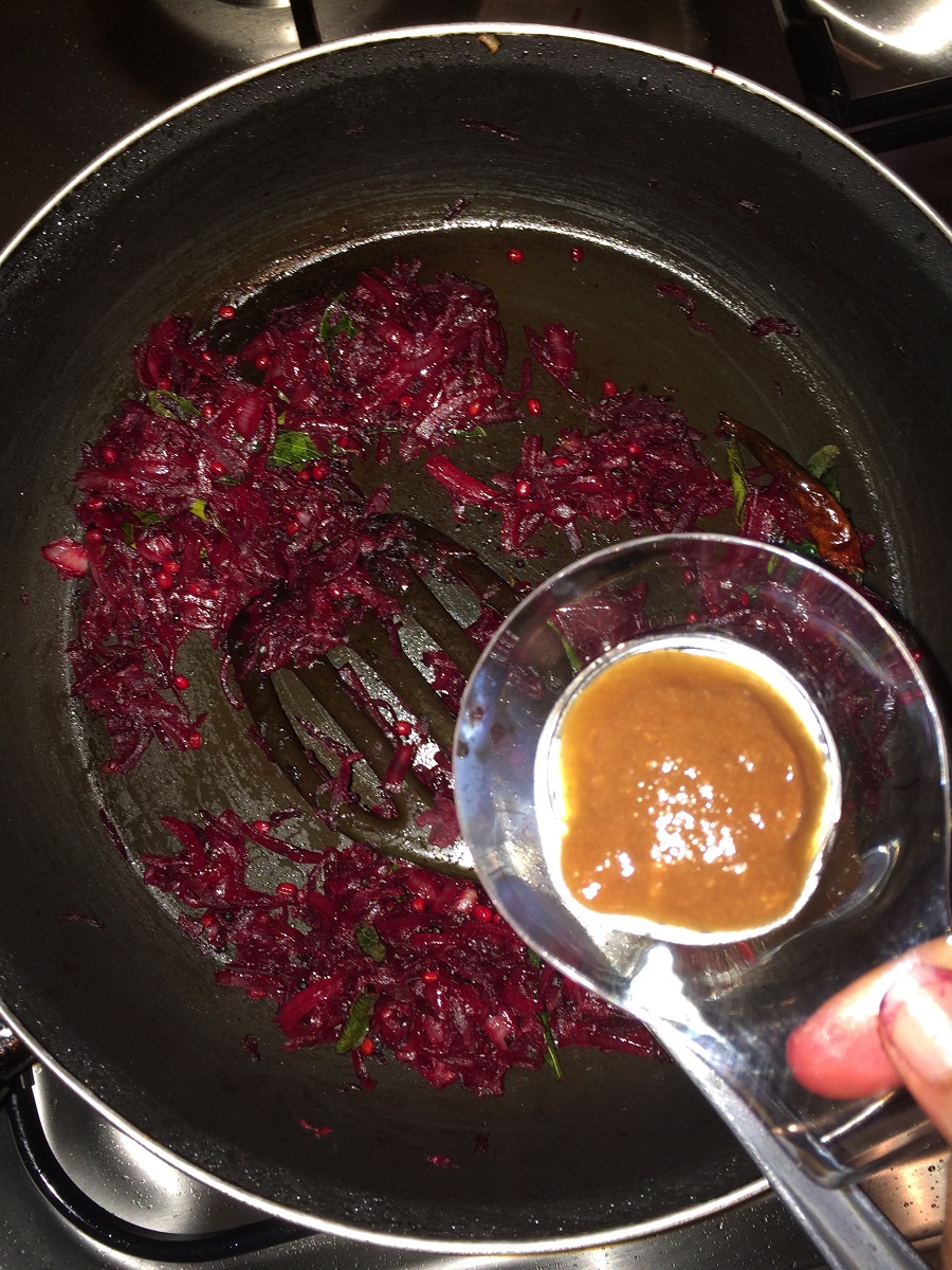 Beetroot is supposed to be sauteed well until the raw smell goes, so to make this easier I grate the beetroot instead of chopping them.