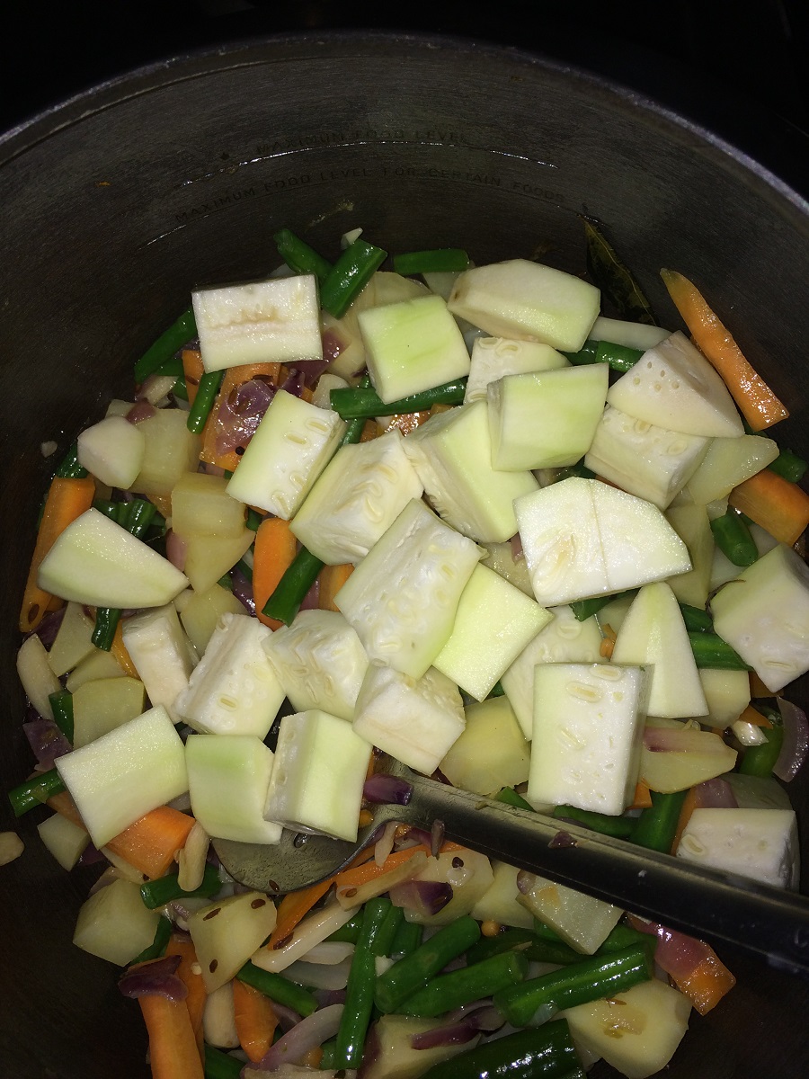 - Now add beans, carrot, potato, sorakai/bottle gourd, tomatoes and brinjal one after the other.