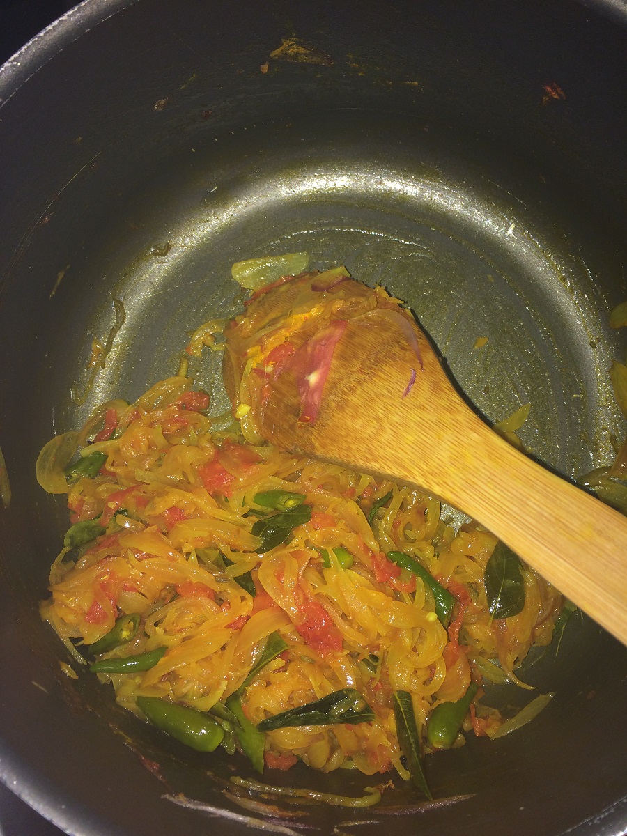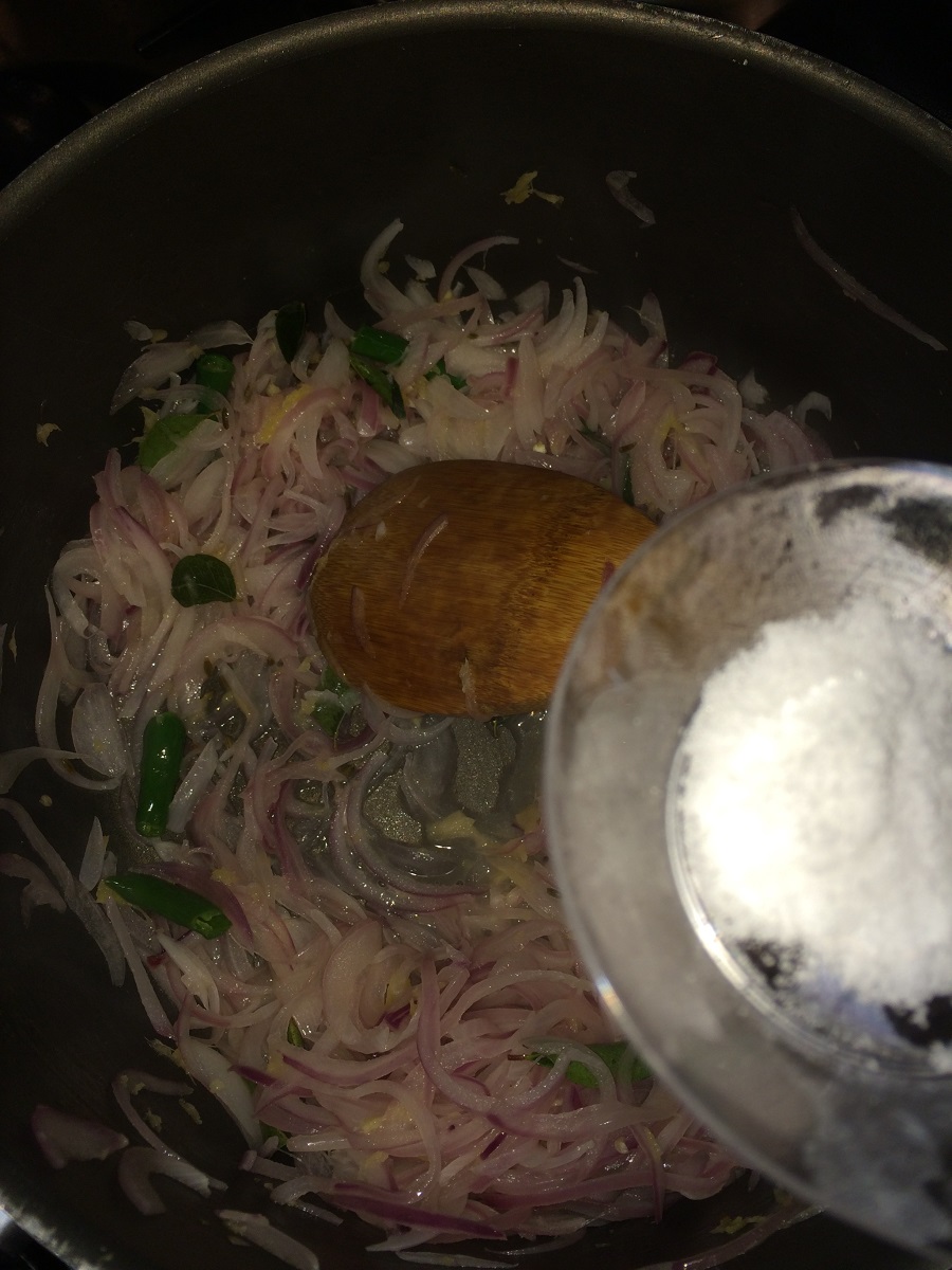- Now add onion,green chilies and salt. Salt only for the onion and tomato, as the potato has salt in it.