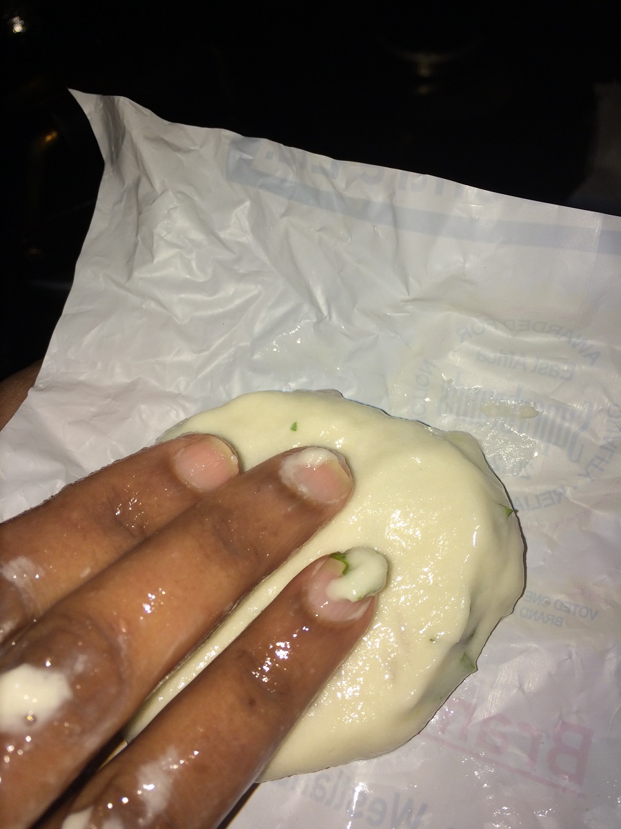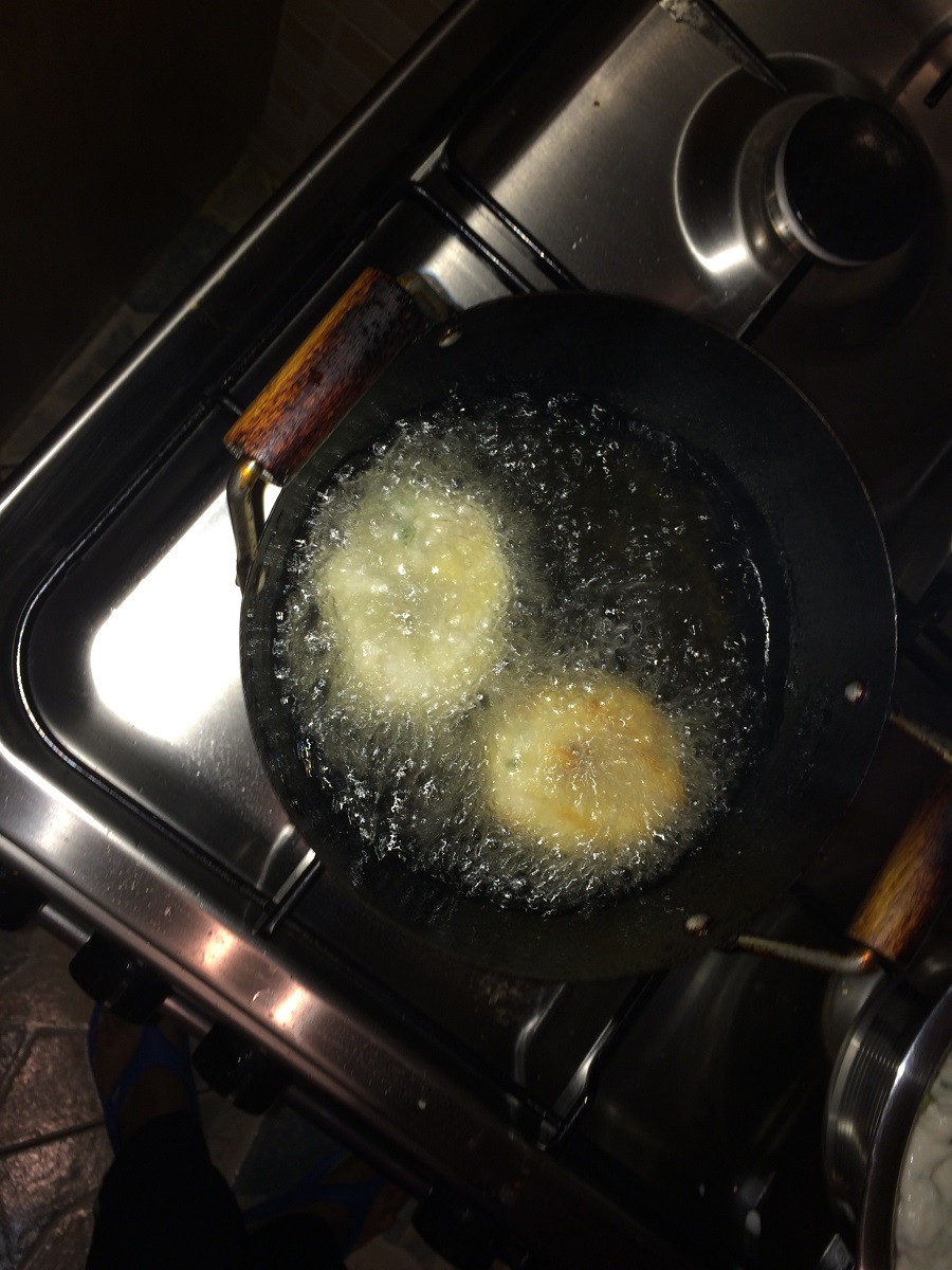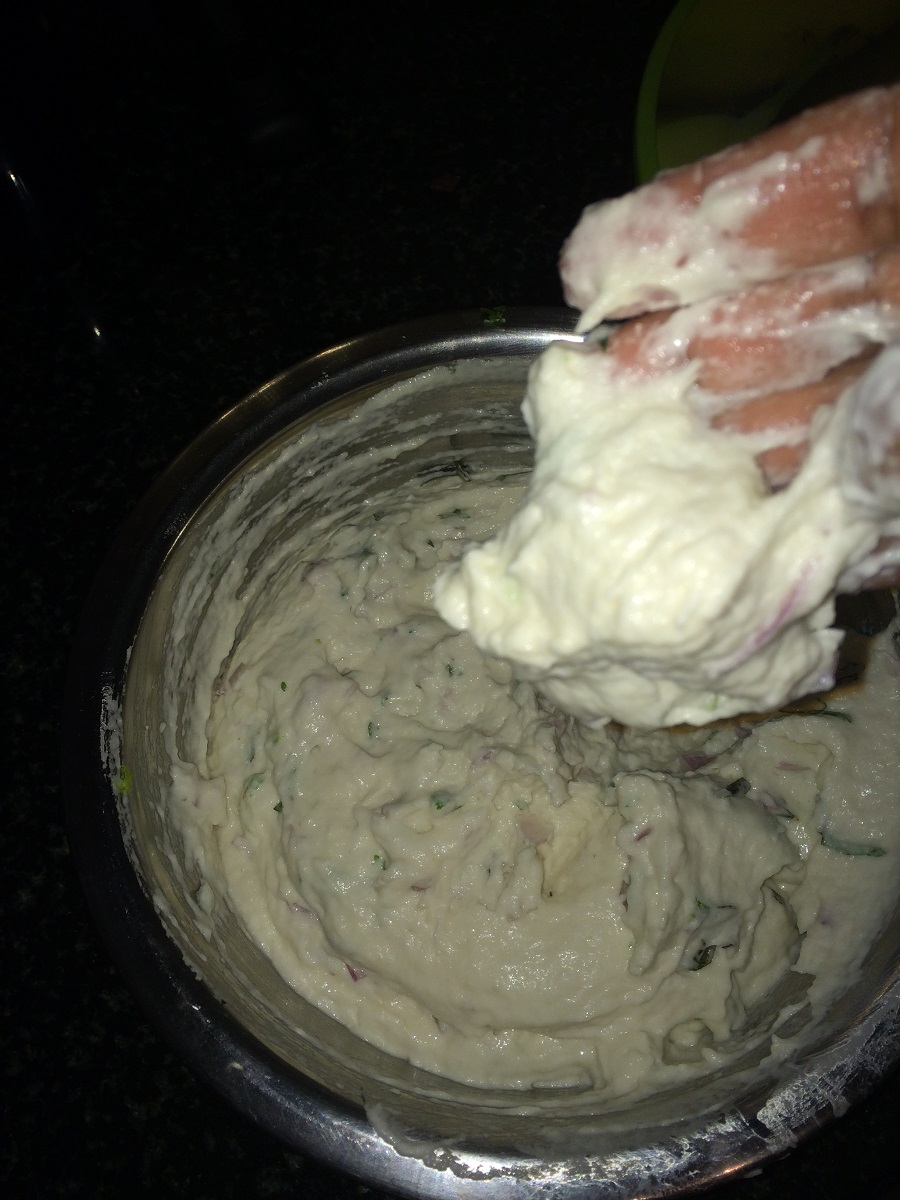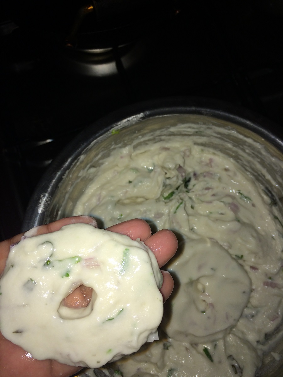 - Now dip your right hand in the water and take a small ball of batter in your hand.
