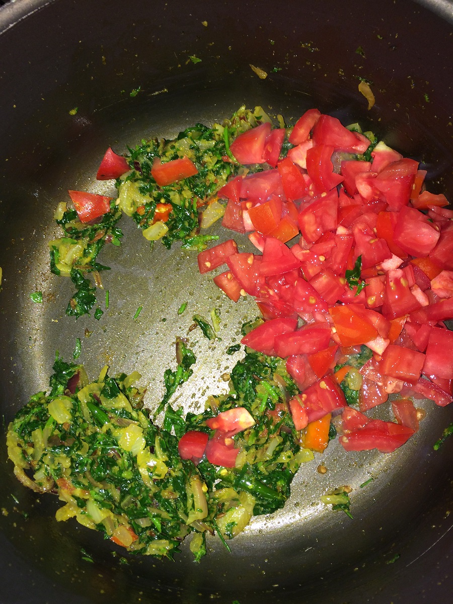 - Time to add the chopped methi leaves. Saute till the leaves wilt the water and get cooked till the raw smell of methi is gone.