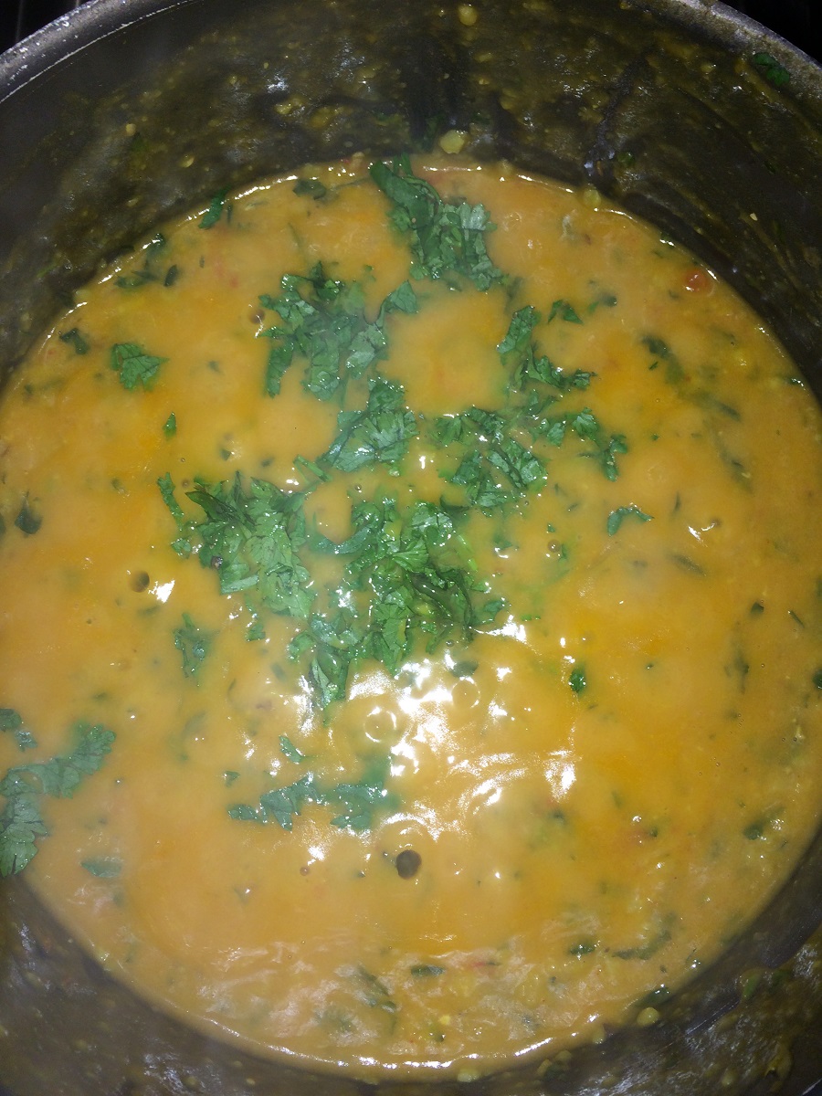- Add the cooked dal with water, cover & simmer till everything blends together.
