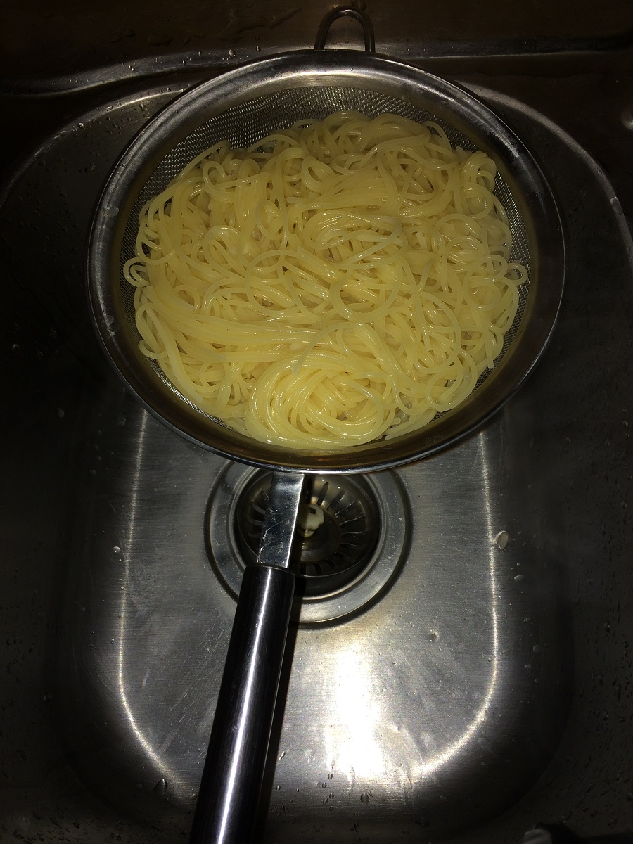 - Drain the spaghetti and run cold water on it to avoid spaghetti to stick to each other.