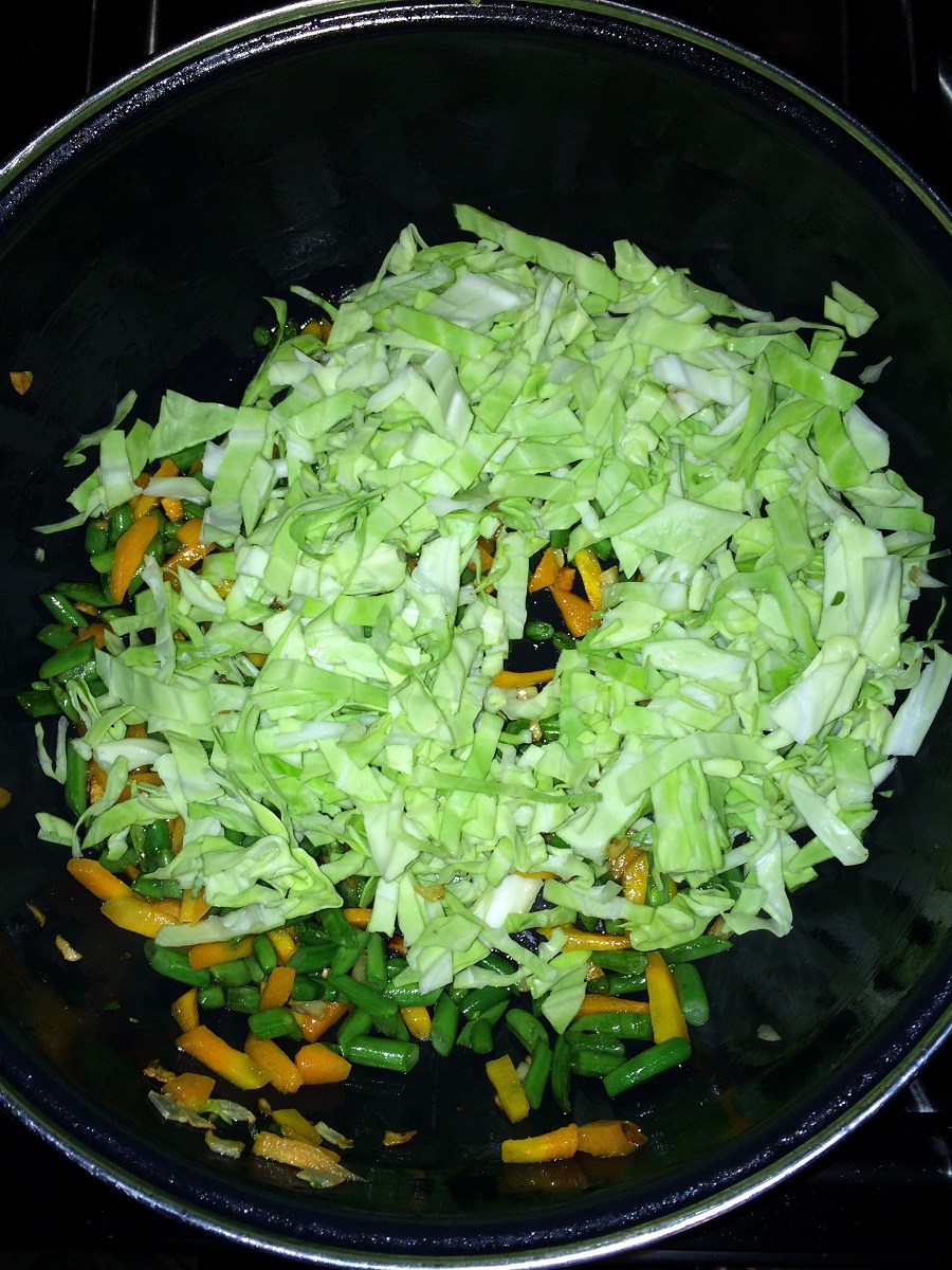 - Add the chopped veggies one by one and saute for few mins each. First beans, carrot and then cabbage.