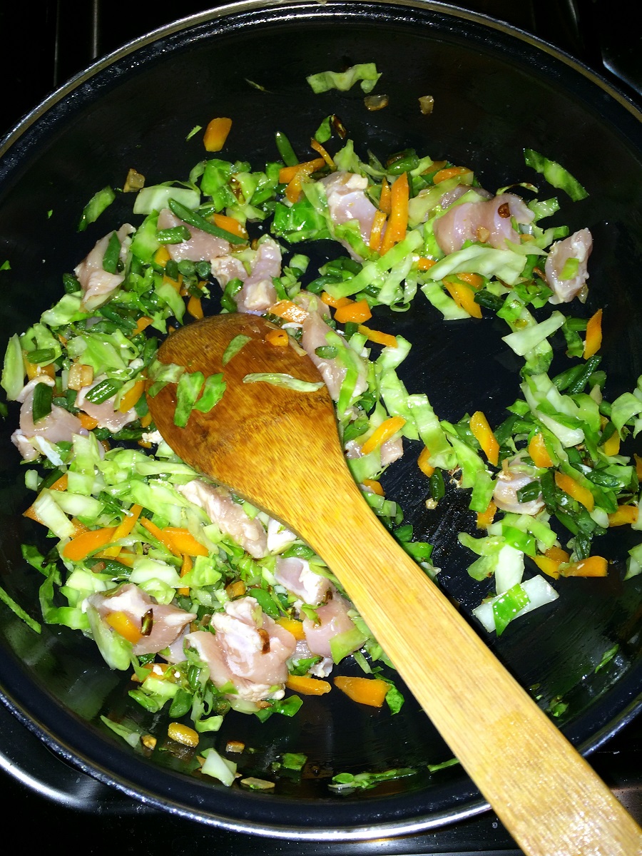 - Saute until the chicken gets cooked and then add required amount of salt for the veggies.