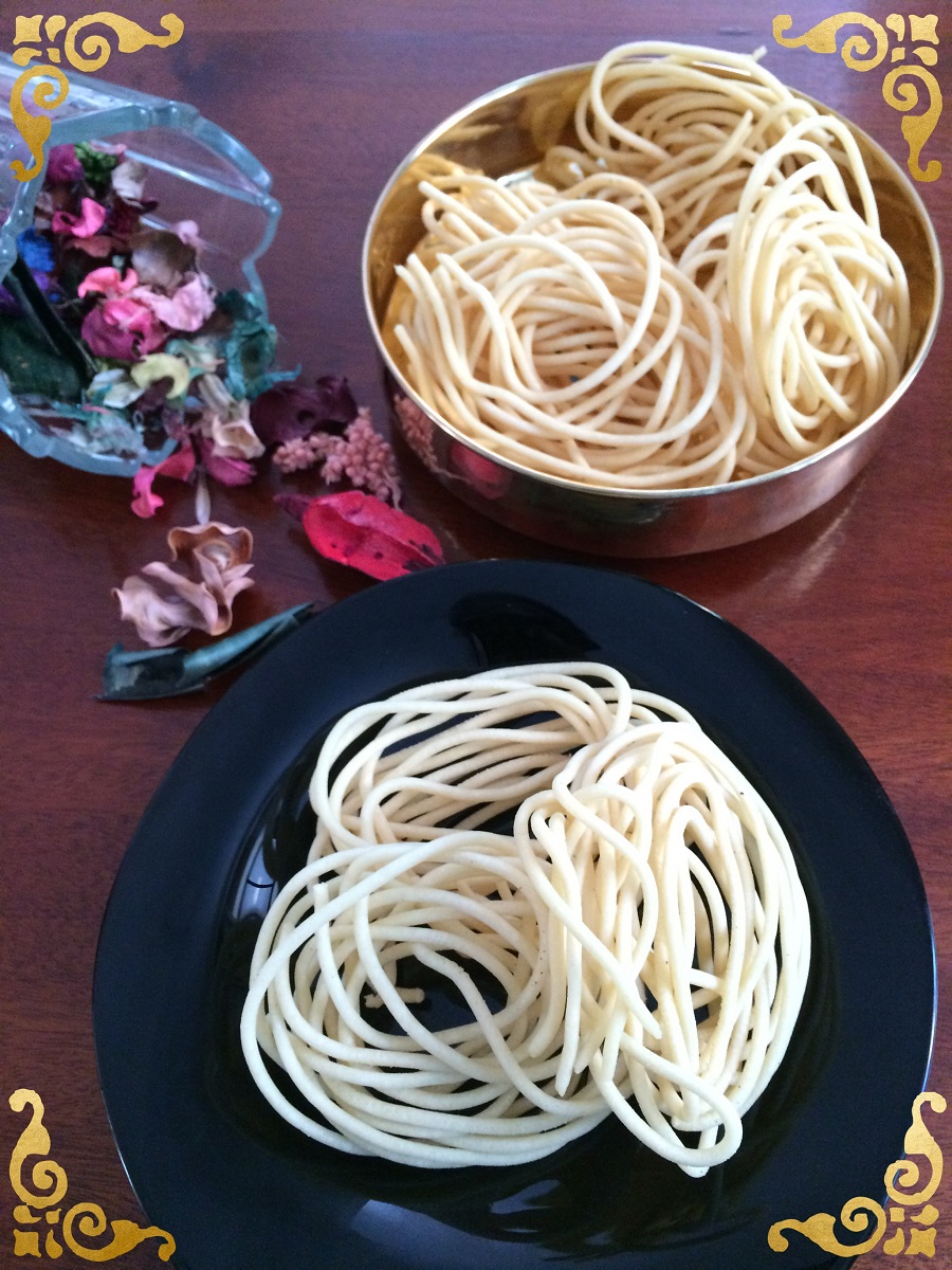 When they make the thenkuzhal they reserve some portion for “PACHA THENKUZHAL”, that is when thenkuzhal is  taken when it is half done. The thenkuzhal is taken immediately after it is dropped in the oil. This is a treat whenever thenkuzhal is made at home. Its so yummy along with sweet chili sauce.