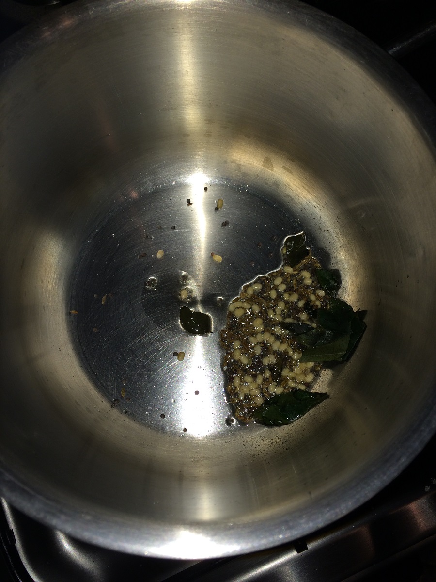- Take oil in a small pan and temper mustard, cumin and urad dal along with some curry leaves.