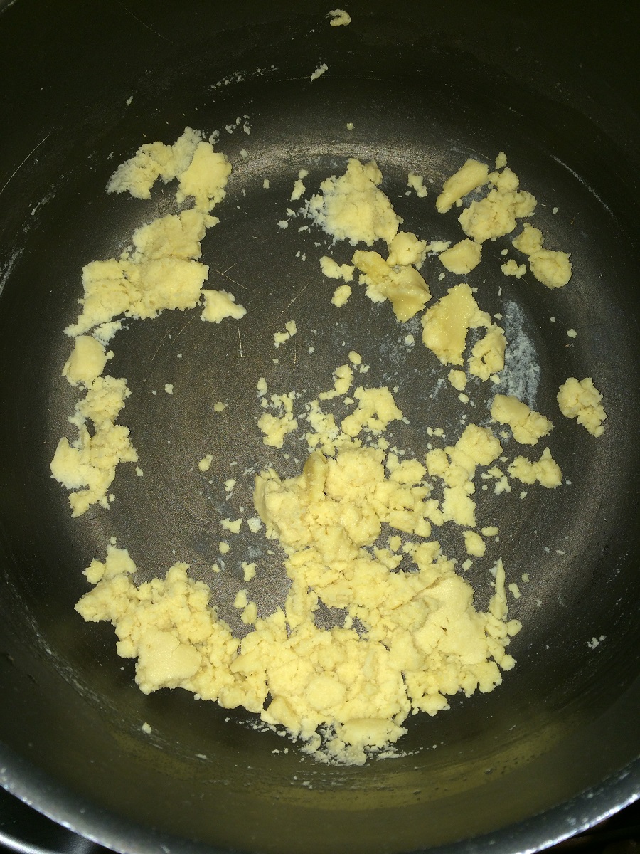 - Add the flour to it and cook to get a sandy consistency.