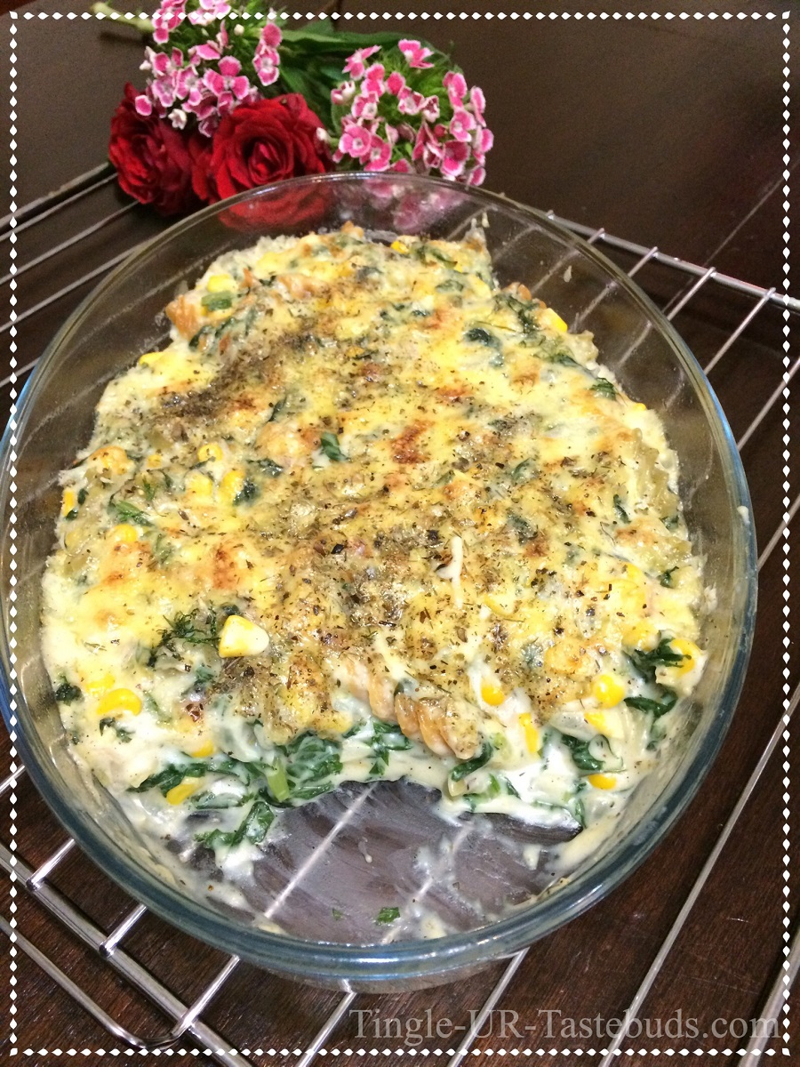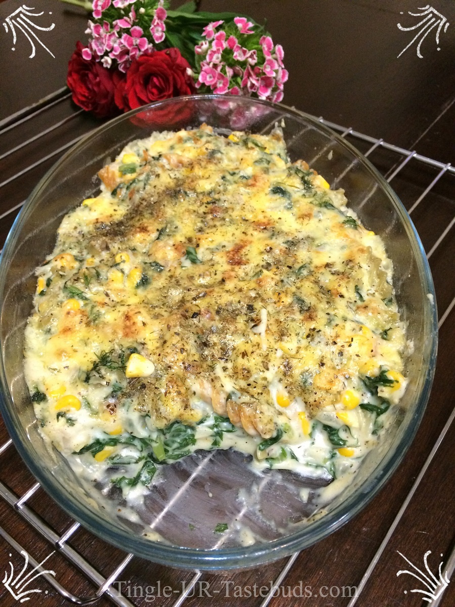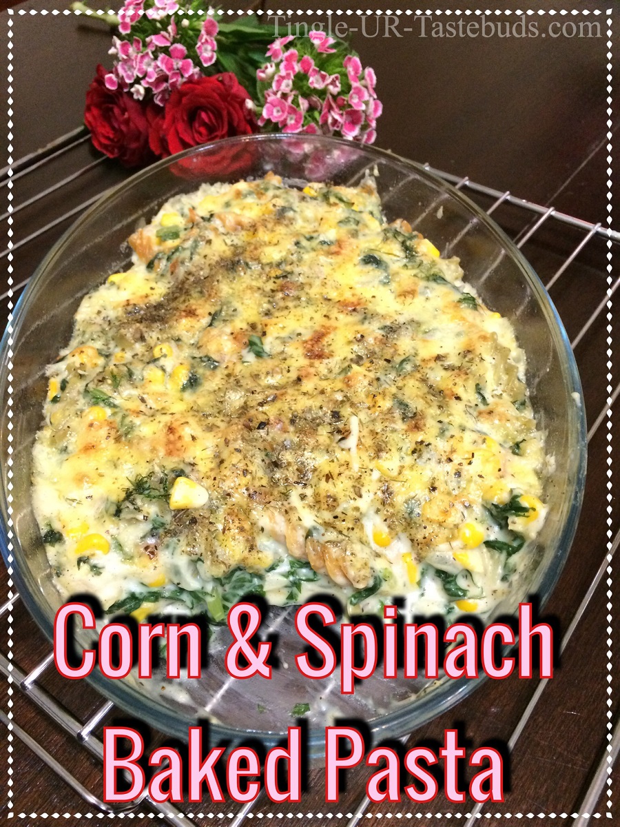 Creamy Baked Corn and Spinach Pasta is ready to be served. This is a wholesome dish. Do leave your comments if you liked it.