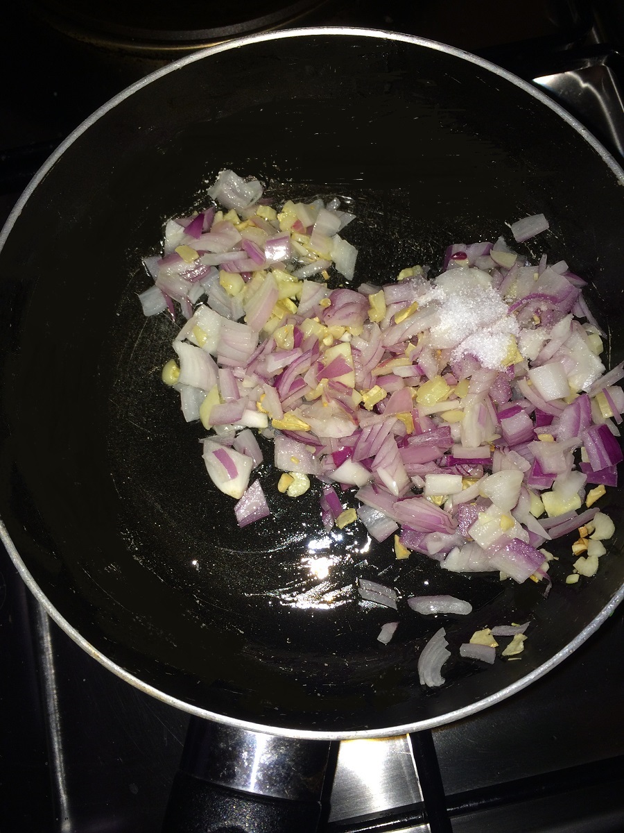- Add chopped garlic and saute for few mins. Then add the onion and salt. Allow the onion to cook for few mins.