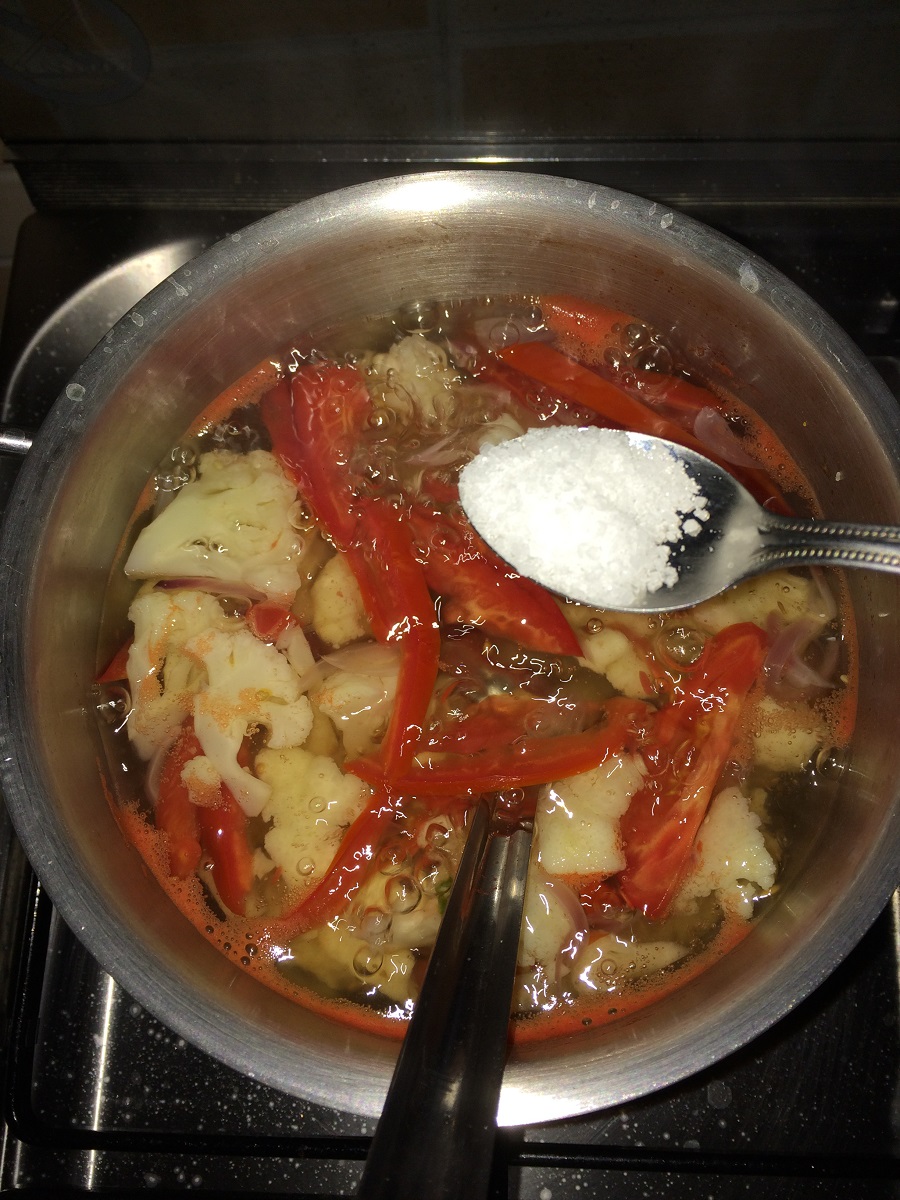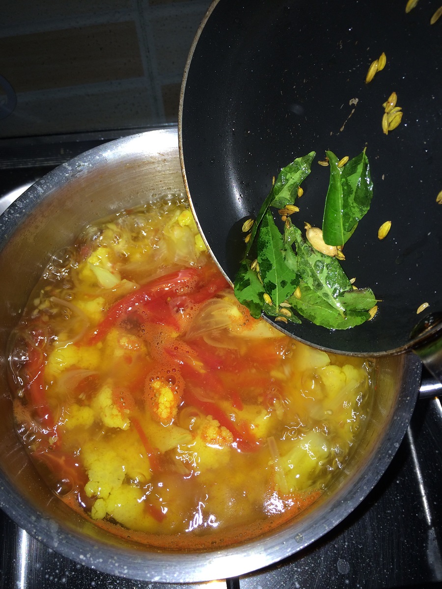 - Take water in a vessel and add the chopped onions, tomatoes and the cauliflower along with green chilies.