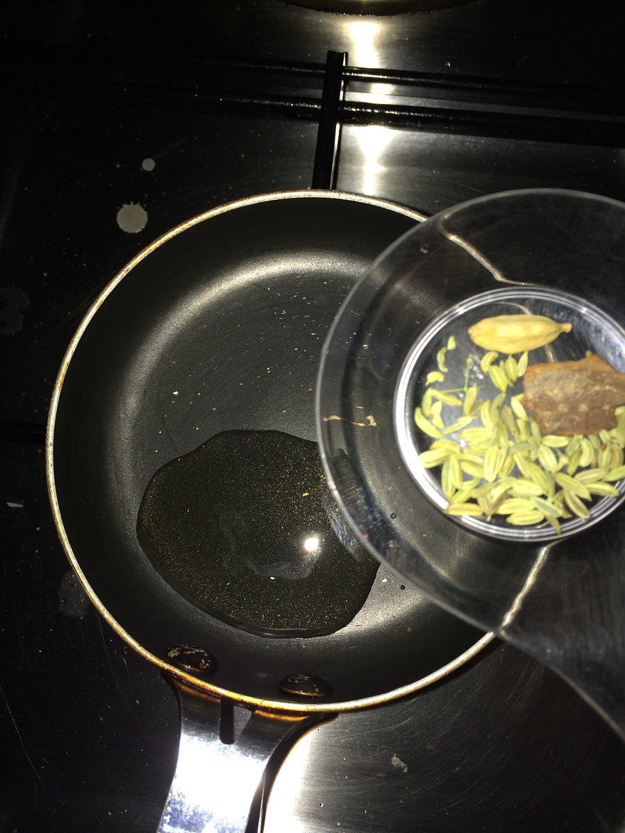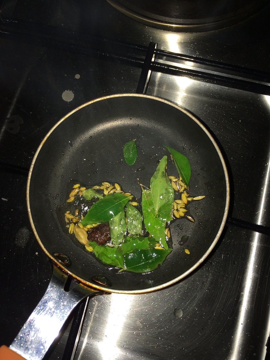 - Now heat a pan with little oil and temper fennel, cinnamon and cardamom along with a spring of curry leaves.