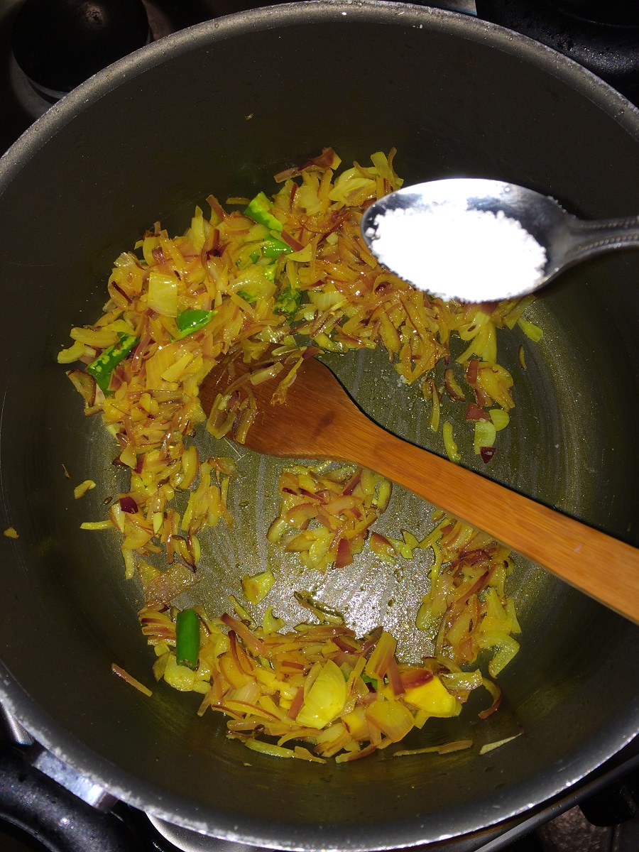 • Now add the chopped onion along with turmeric and little salt. Cook until the onion become translucent.