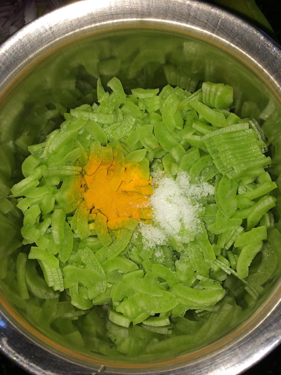 Add salt and turmeric to the chopped Podalangai/Snake Guard.