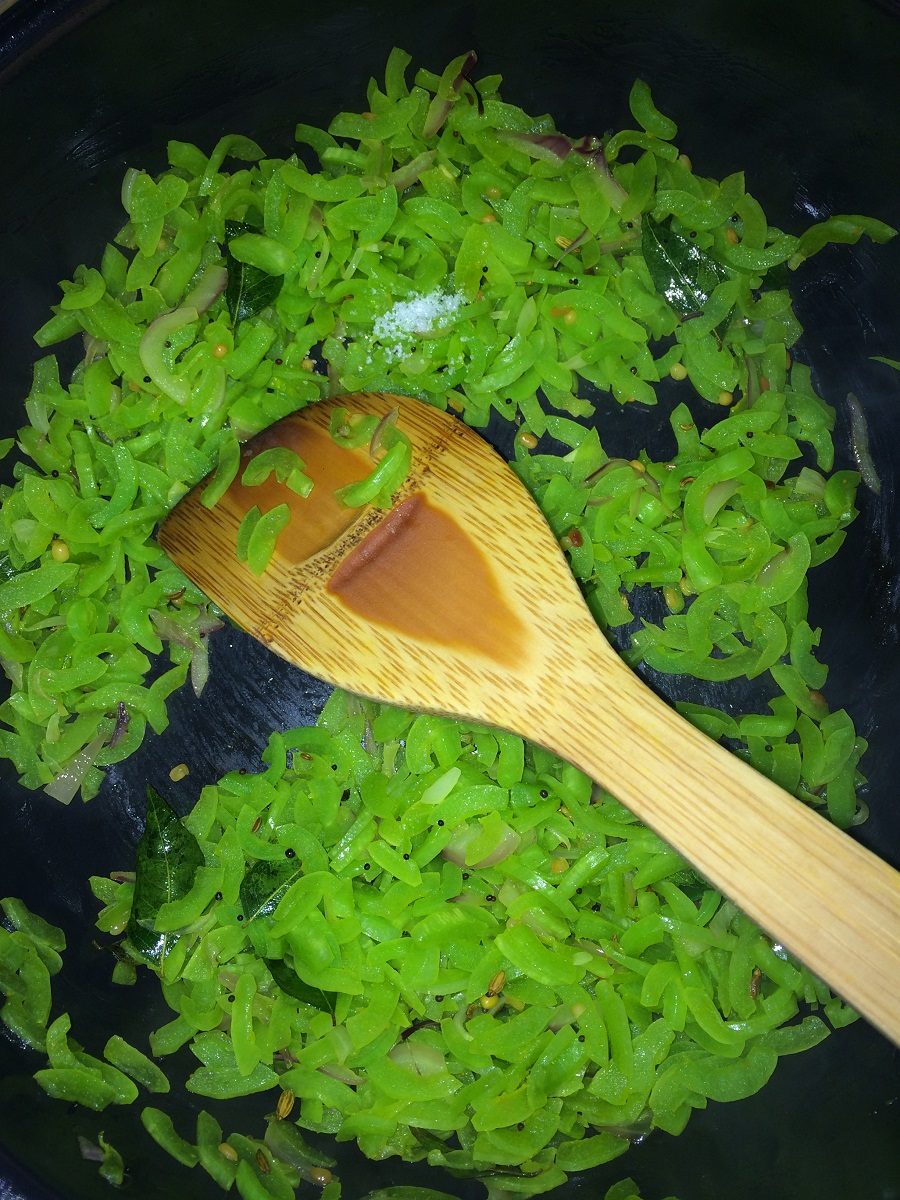 • Now add the squeezed Podalangai/Snake Guard and saute until it is soft.