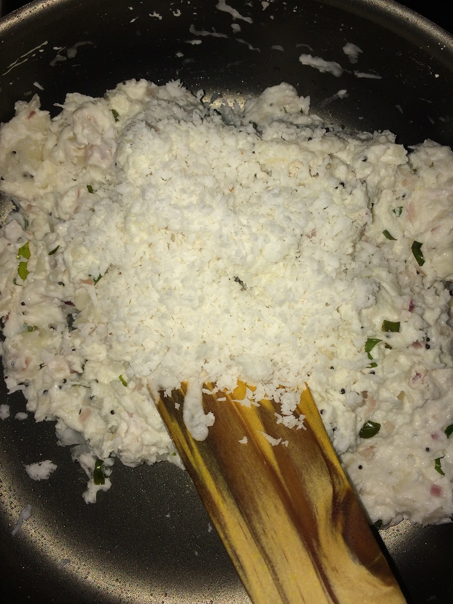 Either can use the freshly grated coconut or dessicated coconut. I prefer adding fresh.