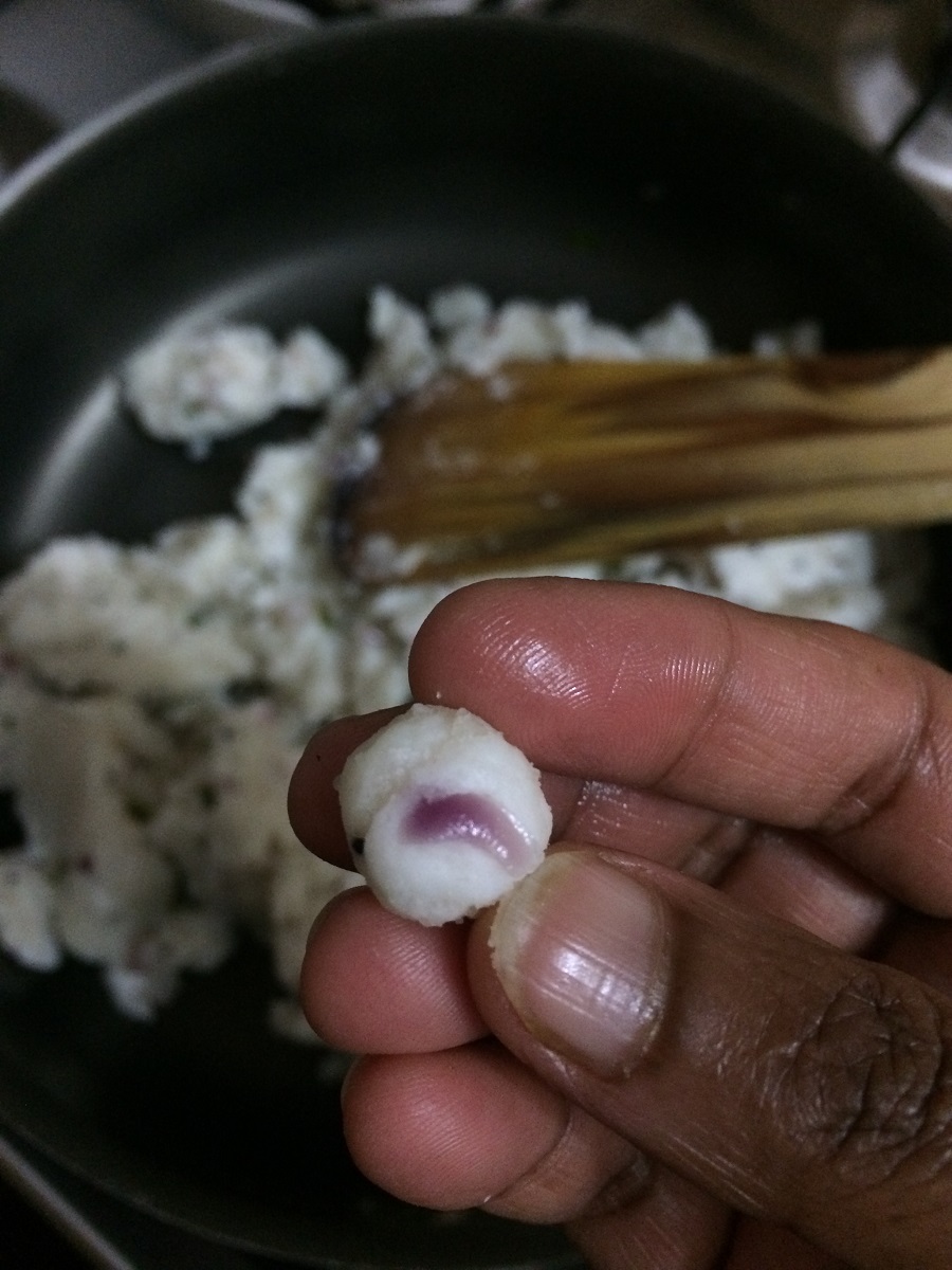 - Cook till the batter turns a dough and to test it take a small piece and roll it, it should be rolable.