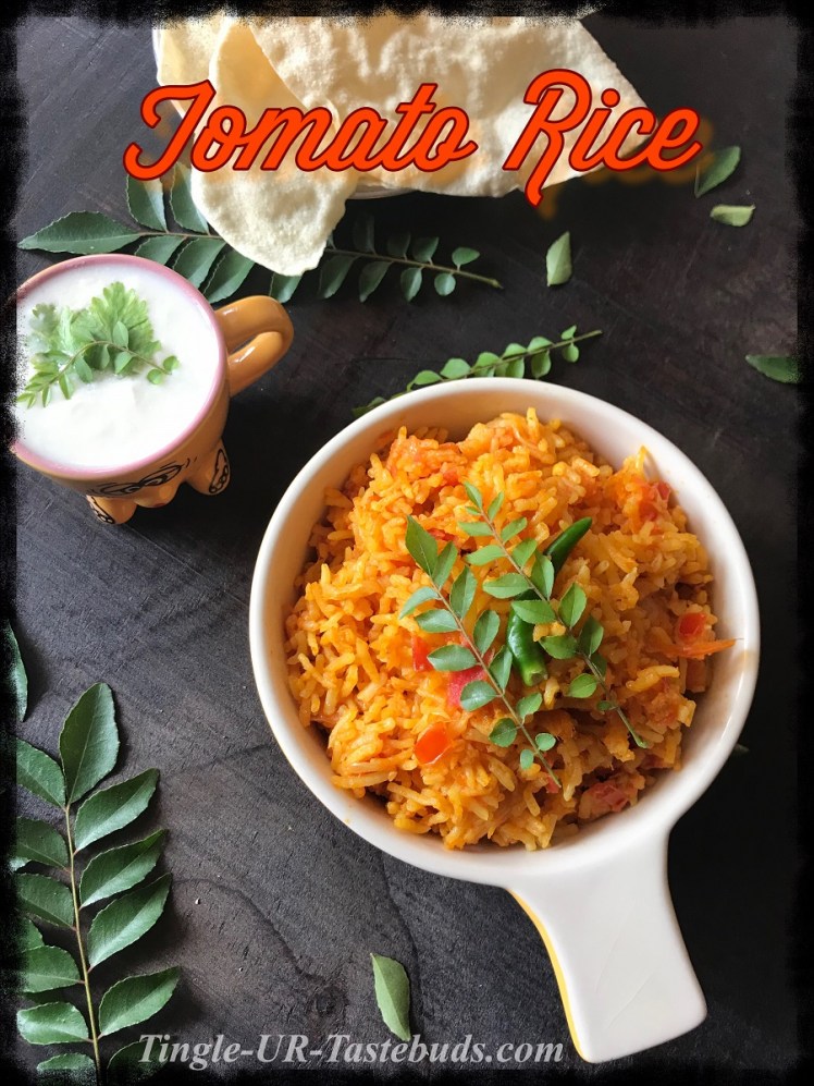 Tomato Rice is a preparation where the rice gets cooked in the juices of the tomatoes and the flavours are subtle. It is not cooked with all the aromatic spices, it calls for only cinnamon stick. Nothing fancy goes into the rice, you can make this with just onion ginger garlic and tomatoes. We generally make this when the tomaotes are cheap.