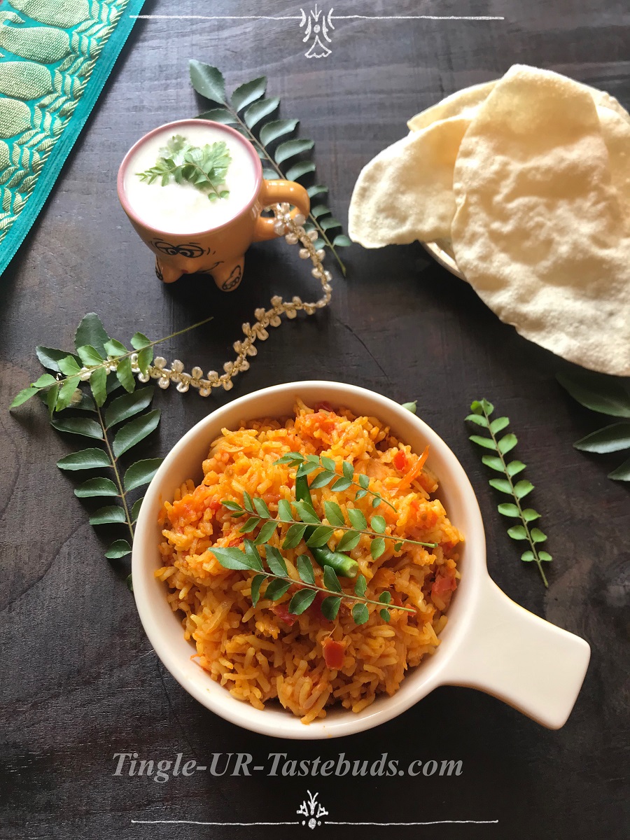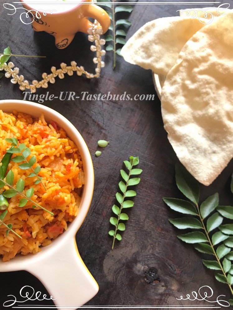 The Tomato Rice/Thakali Sadam is ready to be served. Serve it with Appalam (Papad) along with plain yogurt or Raita on the side. Try and let me know if you liked it.