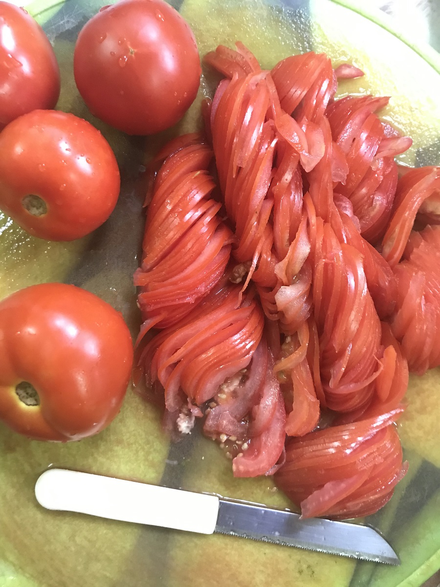 Cutting the tomatoes as thin as shown helps children from trying to remove the cooked tomatoes while eating.
