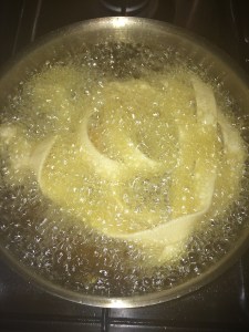 - Heat oil in a vessel for frying the ribbon pakoda.